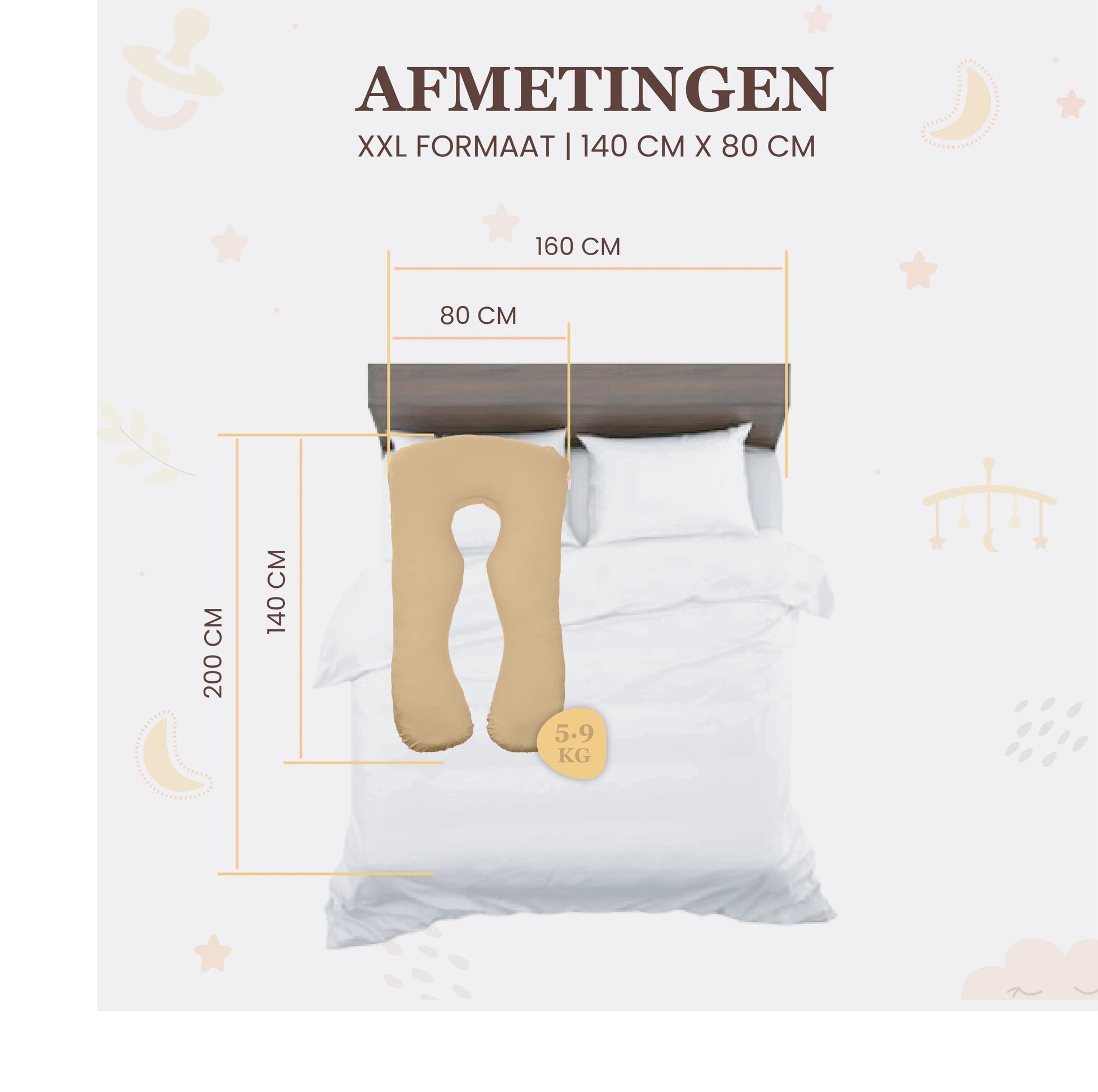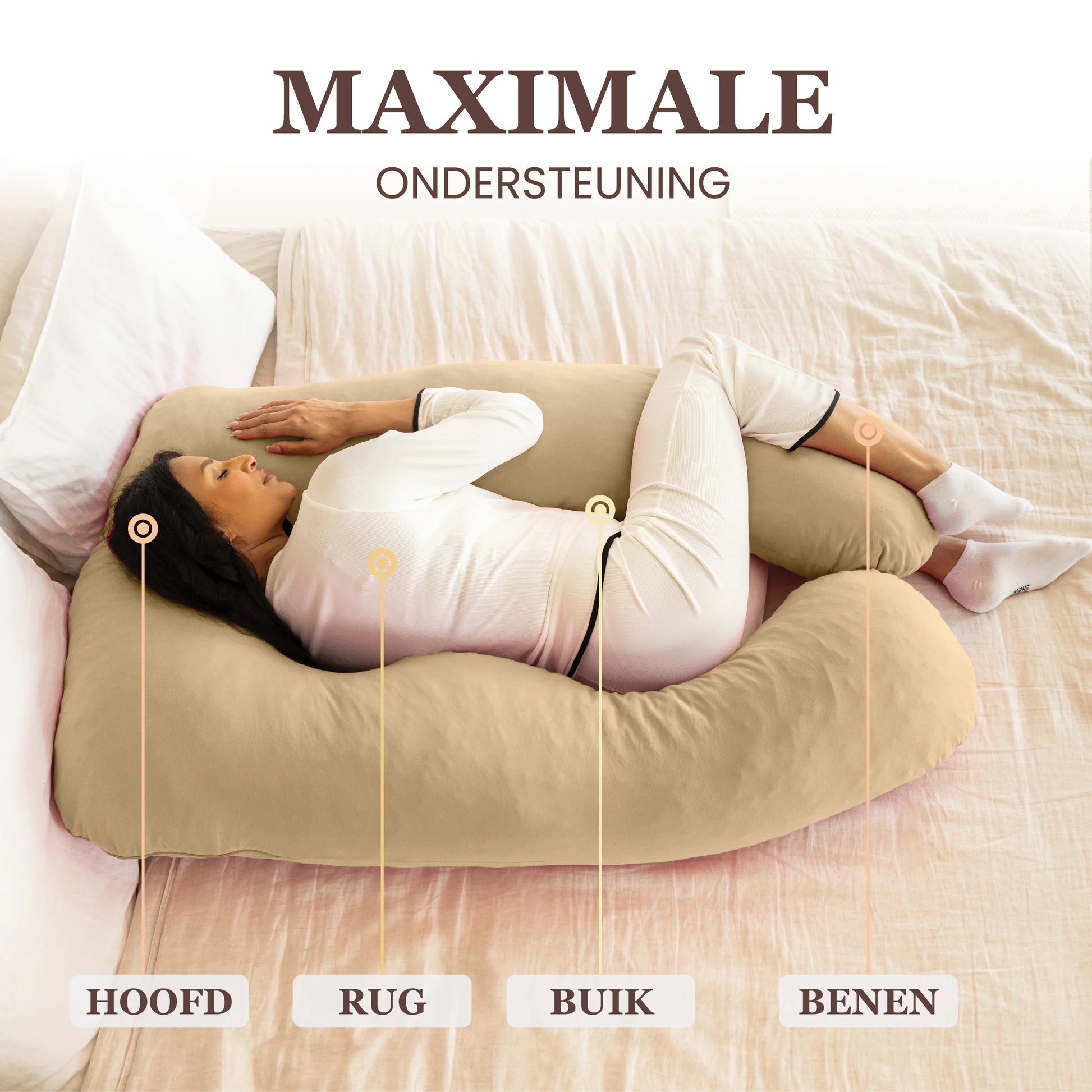 2. Lichaamsondersteuning: Het zwangerschapskussen biedt ondersteuning aan het hele lichaam, met extra aandacht voor het hoofd, de nek, de rug, de buik, de heupen en de benen.