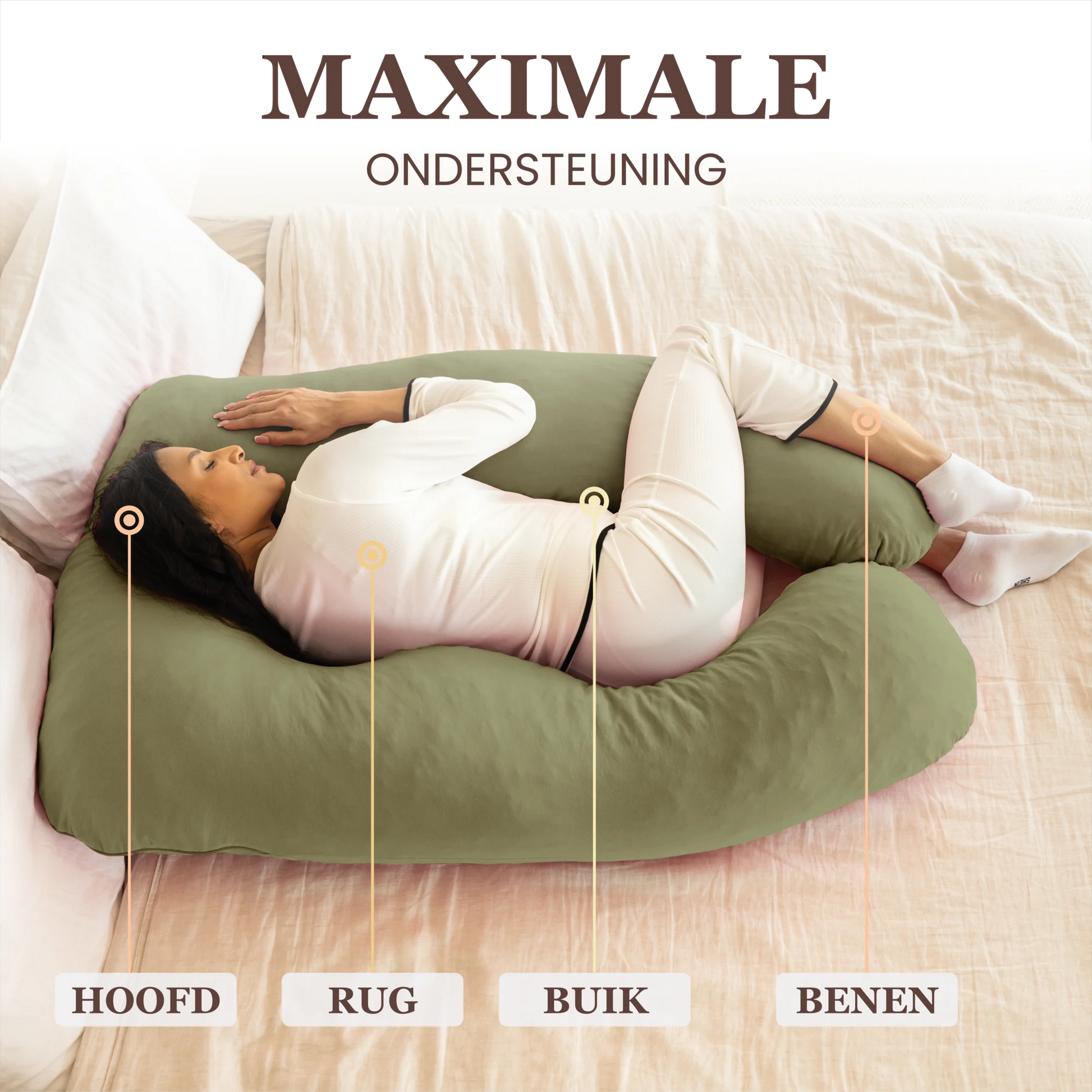 2. Lichaamsondersteuning: Het zwangerschapskussen biedt ondersteuning aan het hele lichaam, met extra aandacht voor het hoofd, de nek, de rug, de buik, de heupen en de benen.