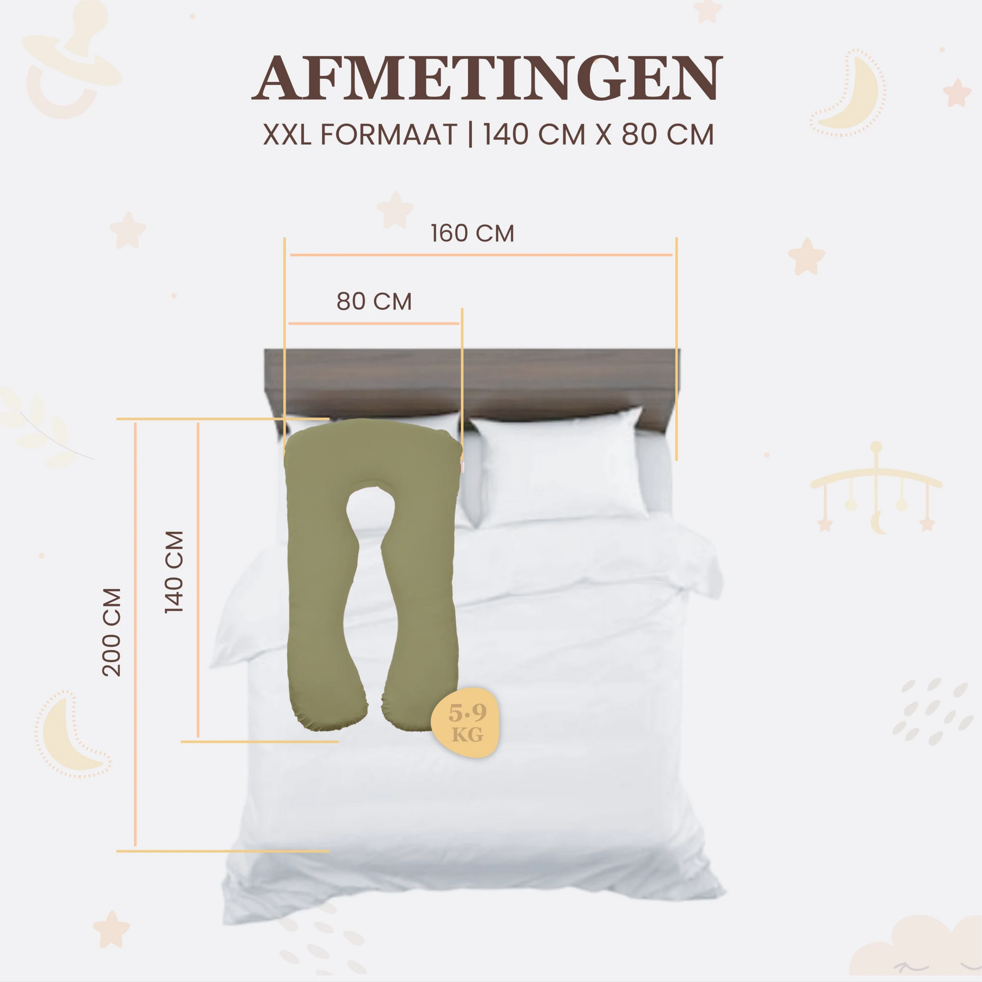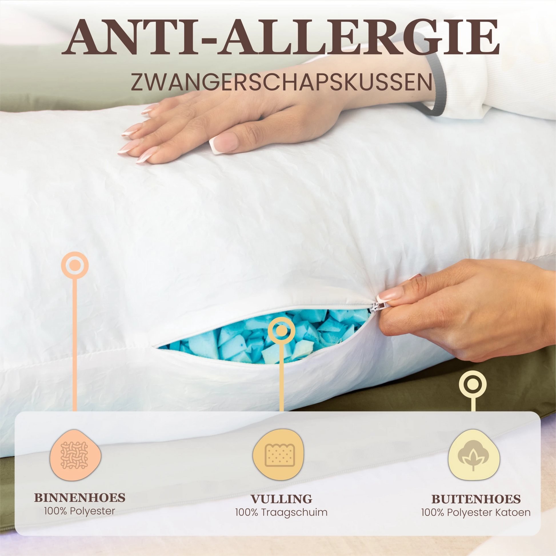 Onze zwangerschapskussens zijn gevuld met ergonomisch traagschuim, wat zorgt voor optimale ondersteuning van je rug, heupen en buik. Het traagschuim past zich perfect aan je lichaam aan, vermindert drukpunten en bevordert een betere slaaphouding, zodat je kunt genieten van een comfortabele nachtrust.