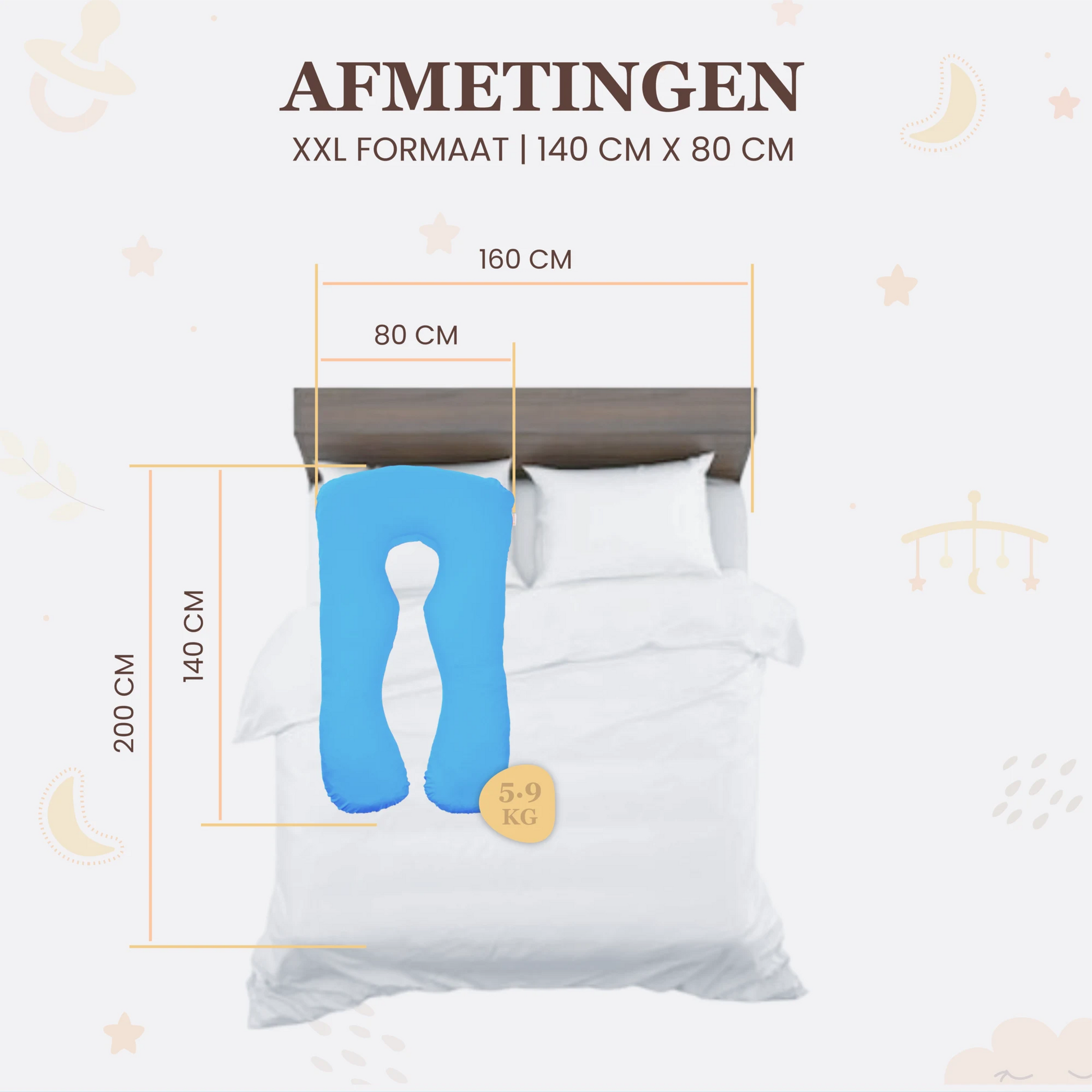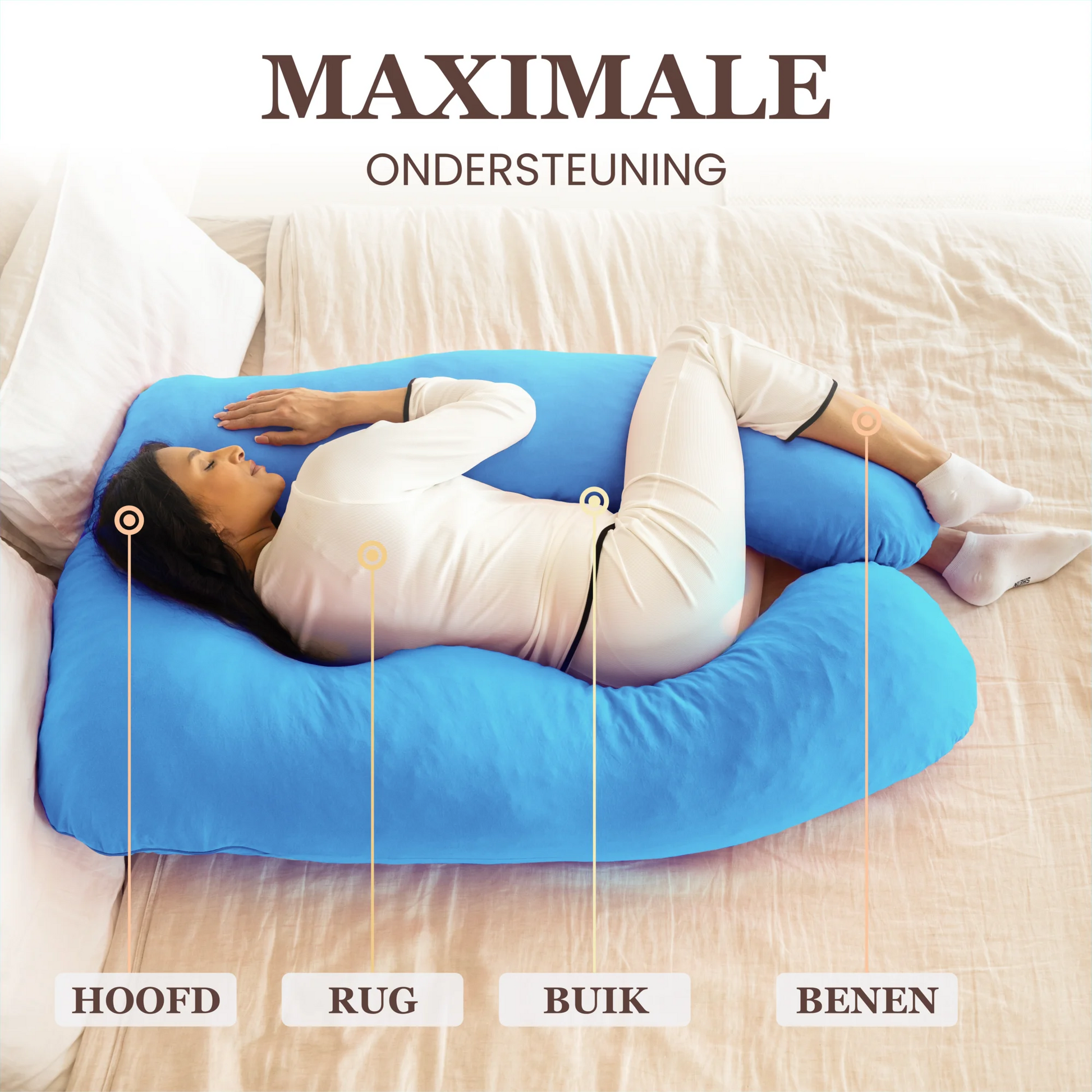 2. Lichaamsondersteuning: Het zwangerschapskussen biedt ondersteuning aan het hele lichaam, met extra aandacht voor het hoofd, de nek, de rug, de buik, de heupen en de benen.