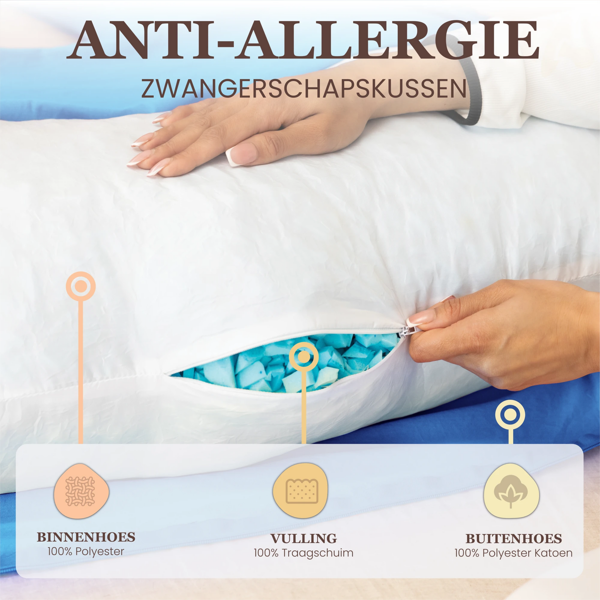 Onze zwangerschapskussens zijn gevuld met ergonomisch traagschuim, wat zorgt voor optimale ondersteuning van je rug, heupen en buik. Het traagschuim past zich perfect aan je lichaam aan, vermindert drukpunten en bevordert een betere slaaphouding, zodat je kunt genieten van een comfortabele nachtrust.
