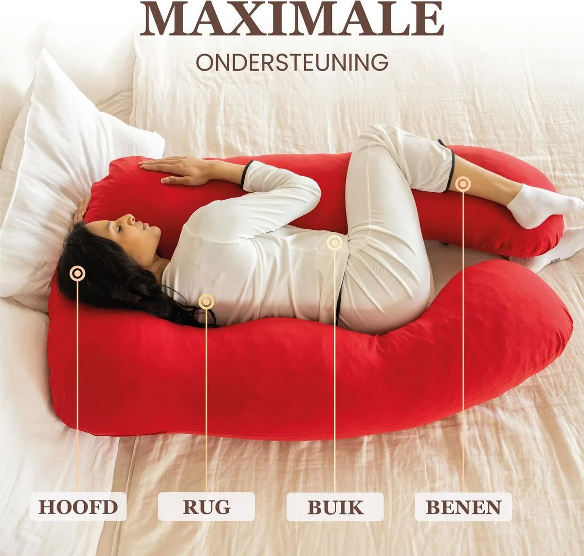 2. Lichaamsondersteuning: Het zwangerschapskussen biedt ondersteuning aan het hele lichaam, met extra aandacht voor het hoofd, de nek, de rug, de buik, de heupen en de benen.