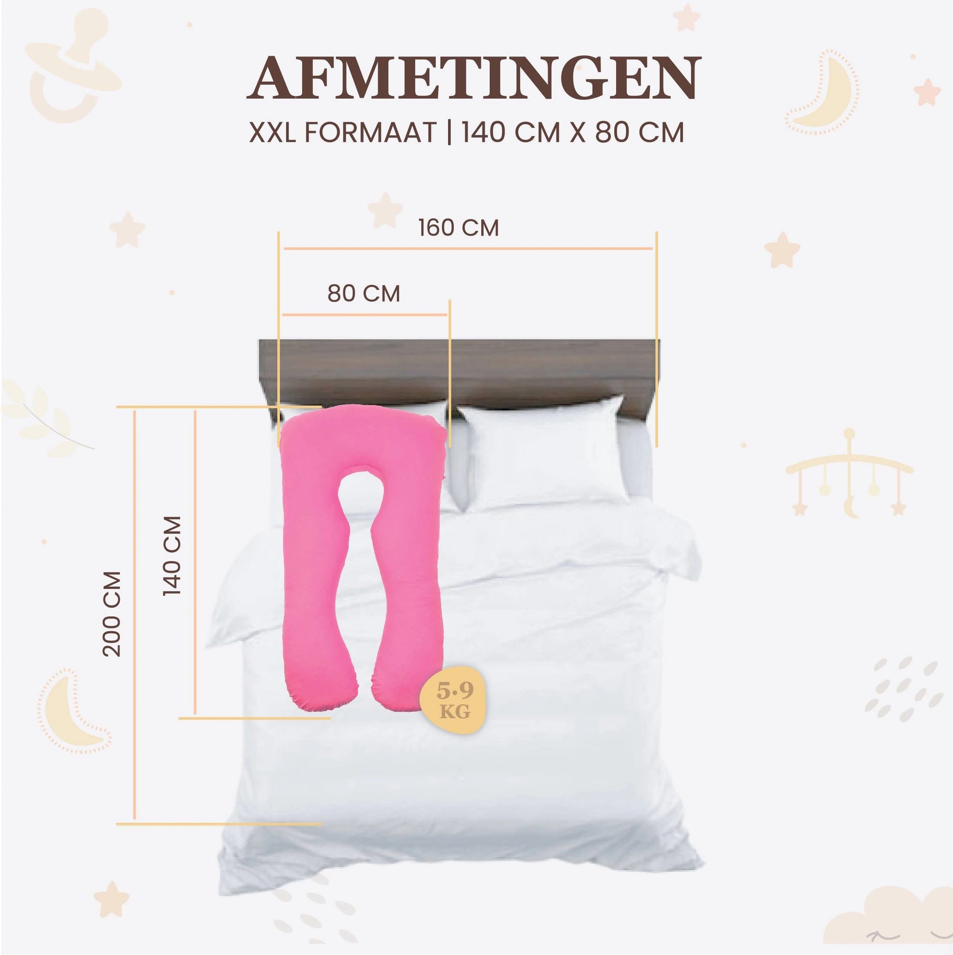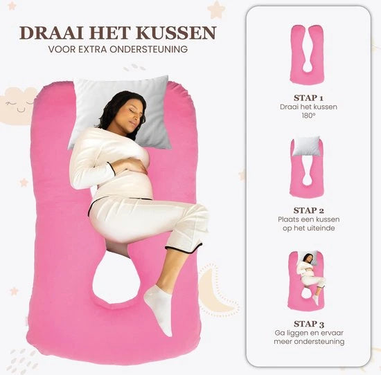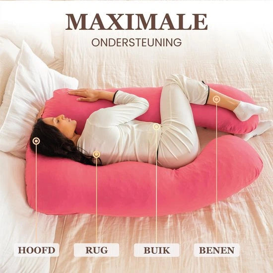 2. Lichaamsondersteuning: Het zwangerschapskussen biedt ondersteuning aan het hele lichaam, met extra aandacht voor het hoofd, de nek, de rug, de buik, de heupen en de benen.