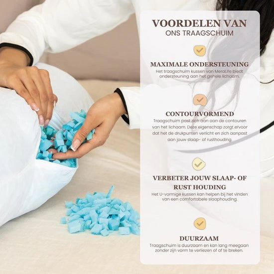 Het MeraLife zwangerschapskussen biedt volledige ondersteuning tijdens de zwangerschap en helpt lichamelijke klachten te verminderen. Het ondersteunt uw buik, verlicht rugpijn en zorgt voor een betere uitlijning van heupen en benen, wat kramp en bekkenpijn helpt voorkomen. Vooral voor zijslapers biedt het extra comfort en bevordert het een ontspannen slaaphouding. Bovendien is het kussen multifunctioneel en ook na de zwangerschap handig, bijvoorbeeld tijdens het voeden. Met een zwangerschapskussen slaapt u comfortabeler en geniet u van optimale ondersteuning gedurende uw hele zwangerschap.